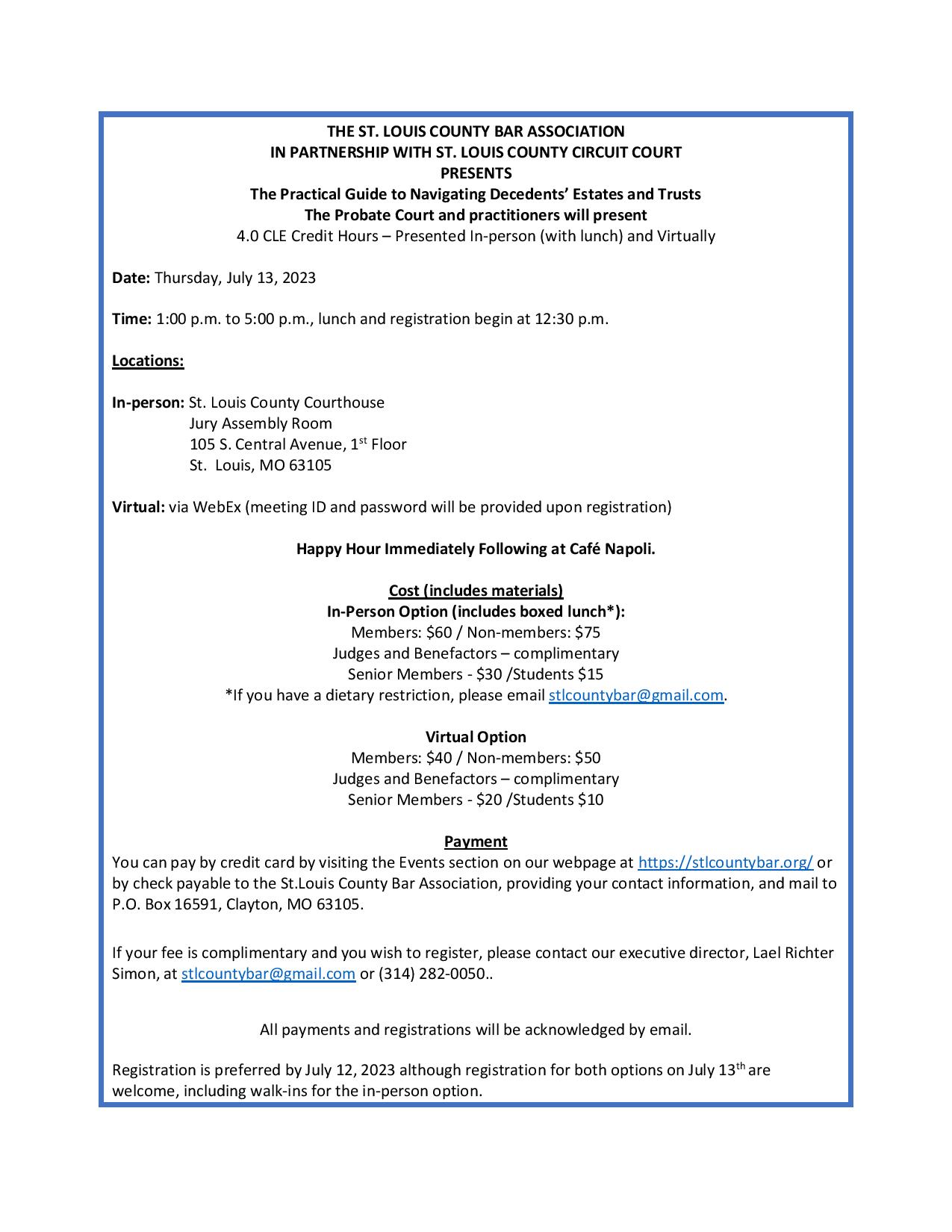 Click the button below to make an event fee payment to the St. Louis County Bar Association.