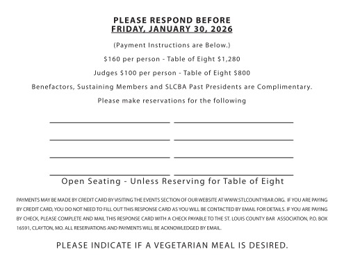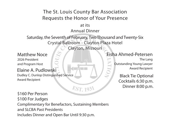 A printable version is available at Annual Dinner invitation and Annual Dinner RSVP or visit the SLCBA website at https://stlcountybar.org/events. All information may be sent via email.